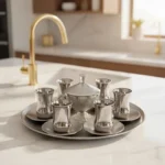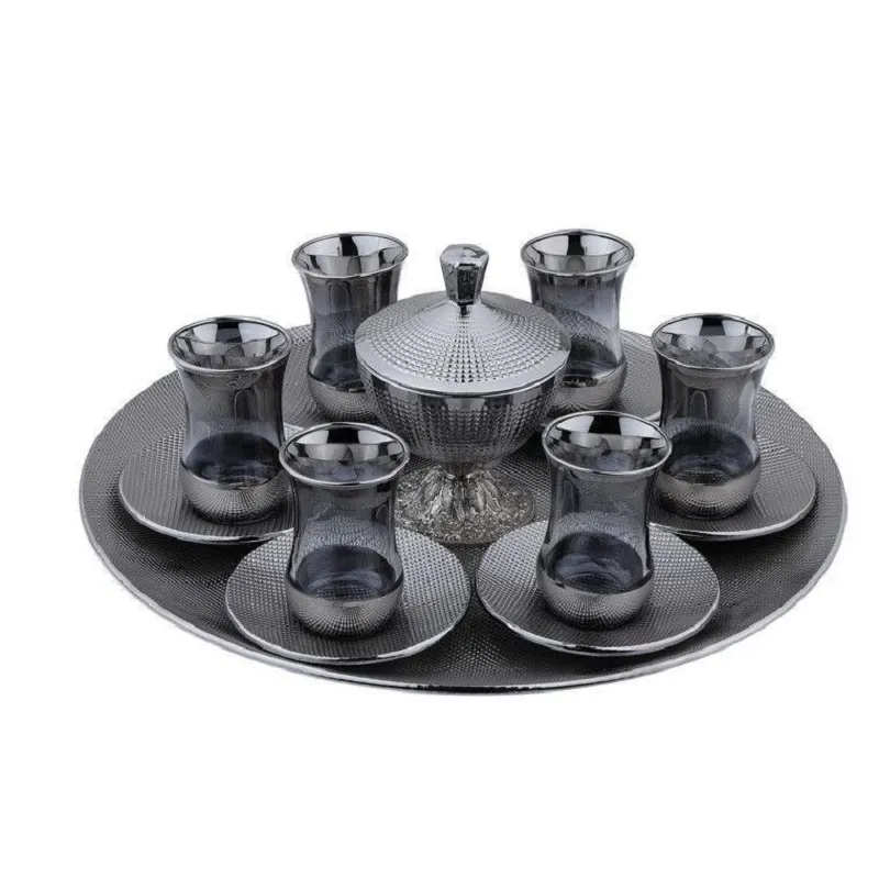 سرویس چای خوری 15 پارچه نقره ای لورنزا مدل خاتم کرزیتسرویس 15 تیکه دارای استکان و نعلبکی و سینی و قندان با درب و پایه فلزی قندان در دو رنگ طلائی و نقره ای که برای پذیرائی مهمان های خاص طراحی و ارائه شده است.