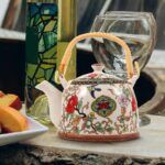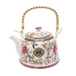 قوری چینی گلدار دسته حصیری له همراه صافی استیل – گنجایش 600 میل